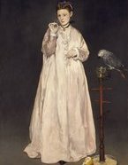 le portrait en pied du début de cet article – qui figure sur l’affiche de l’expo – s’intitule « jeune dame en 1866 » ou « la femme au perroquet », qui était une réponse d’édouard manet à un peintre qui prétendait qu’on ne pouvait évoquer la sensualité avec des modèles habillés. les symboles dont manet parsème sa toile – la posture mi-alanguie, mi-provocante de la jeune femme, son tour de cou, la lorgnette qu’elle tient de la main gauche, probable cadeau d’un amant invisible, sa chemise de nuit elle-même – sont autant de preuves, pour l’époque, de l’érotisme de la scène.