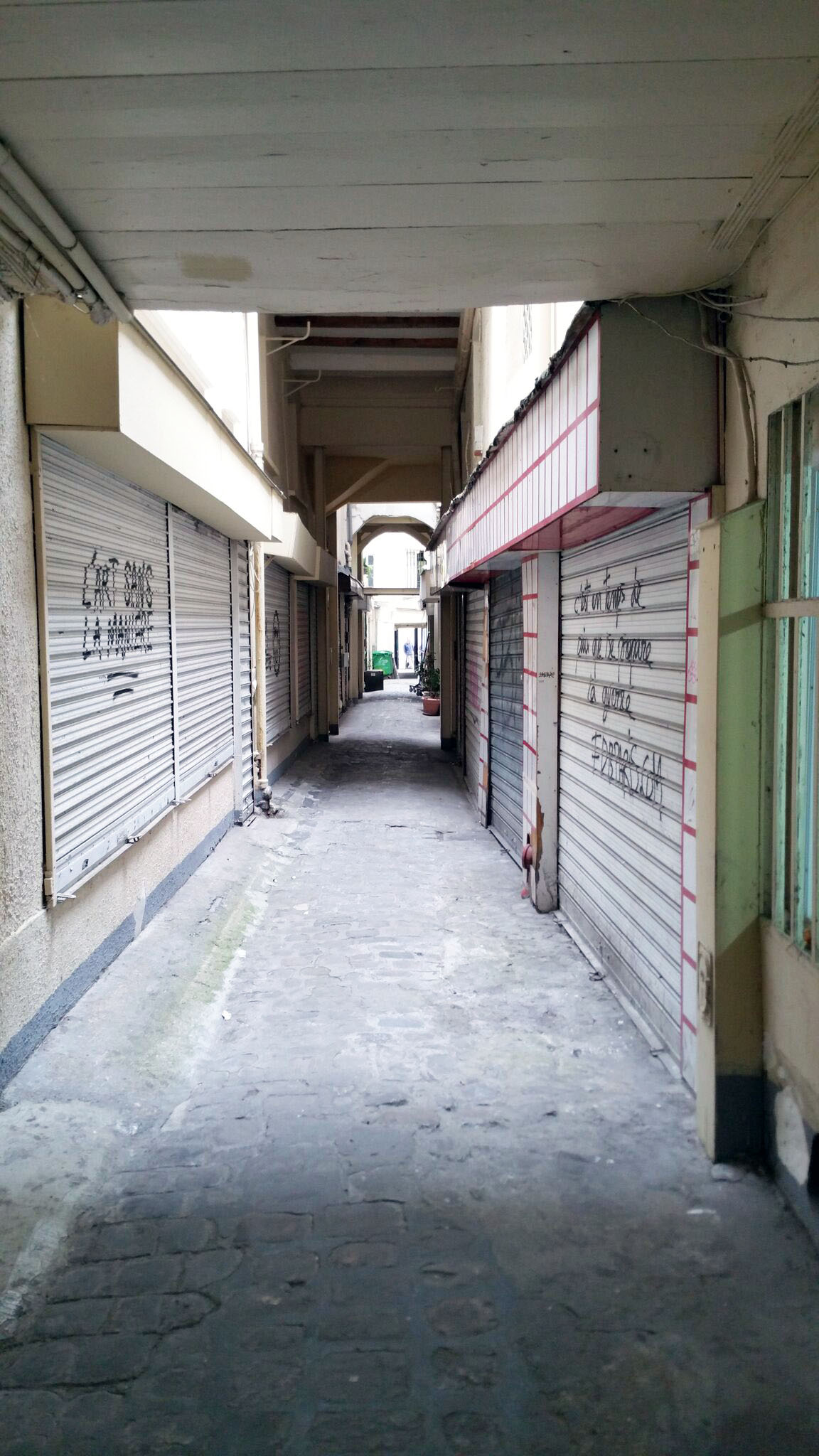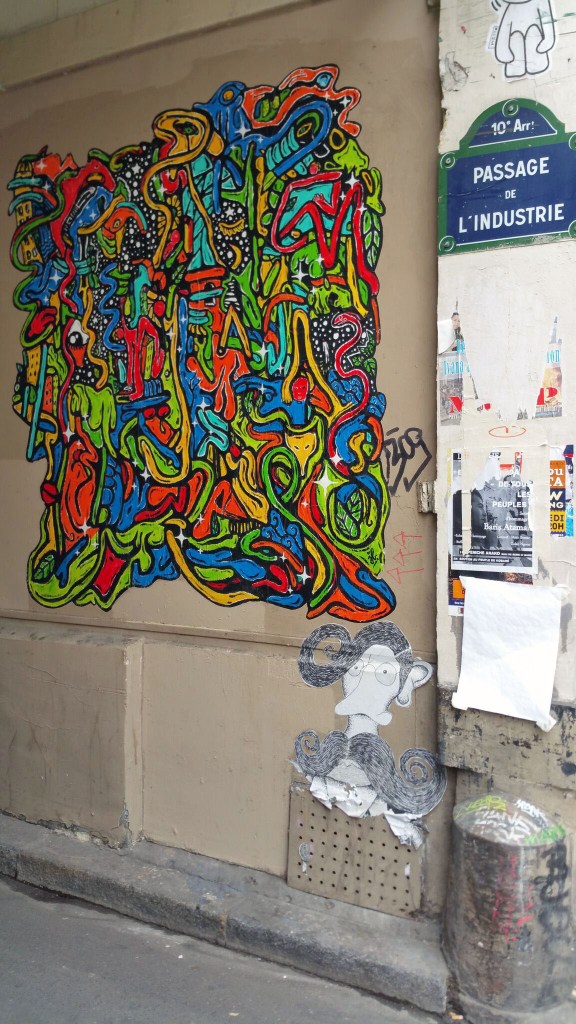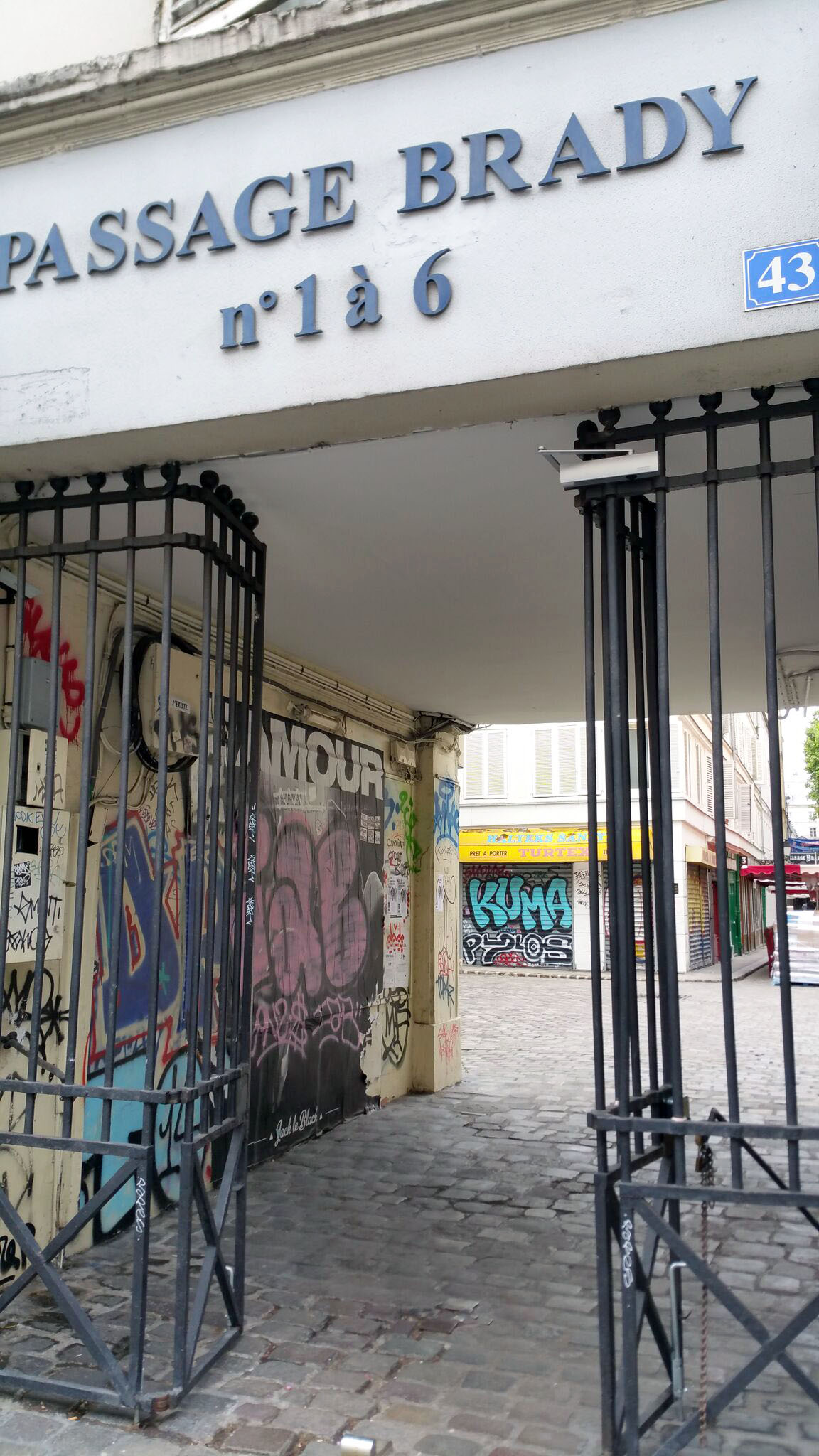 passage du désir. en sortant du métro château d’eau, stressés par l’atmosphère électrique de la faune locale, on n’a pas trop traîné. fermé par des grilles (on s’est rendu compte par la suite qu’il suffisait d’appuyer sur n’importe quel bouton pour ouvrir la grille, mais on a eu la flemme de retourner, lol), le passage a tiré son nom d’un hôtel de passe.