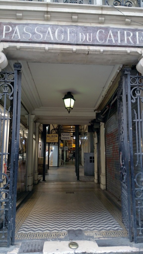 passage du caire. construit en 1798 sur l’emplacement de la cour des miracles, lieu célèbre au moyen-âge où squattaient filles de joie, mendiants, pickpockets (les vendangeurs de costes) et autres vrais et faux estropiés. la place fut vidée en 24h par une policier efficace, après quoi les habitants du quartier s’écrièrent « bonne nouvelle! », exclamation qui donna son nom au quartier. le passage est dû à bonaparte, rentré de sa campagne d’égypte et fasciné par les souks du caire. c’est le passage le plus long de paris, avec trois galeries et des décorations très couleur locale.