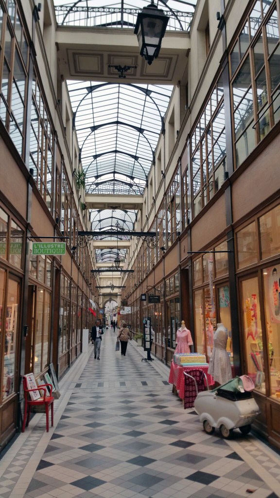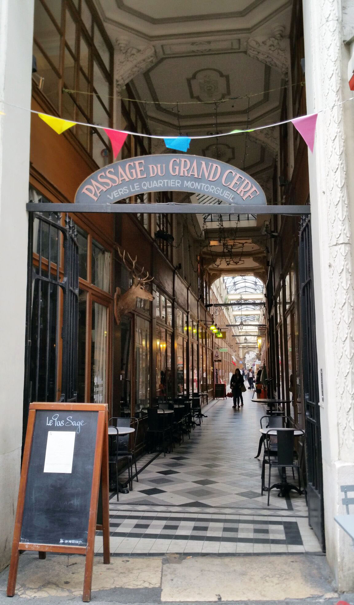 passage du grand-cerf. jusqu’à la révolution, c’était une ruelle qui aboutissait à l’hôtellerie du grand cerf, d’oû partaient les diligences pour l’est de la france. elle sera couverte et transformée en passage en 1835. avec sa grande verrière et ses plafonds immenses, ses passerelles et ses ferronneries, ainsi que ses boutiques d’artisans, d’antiquités et de bijoux, c’est le moins représentatif mais aussi le plus beau de tous les passages du parcours…