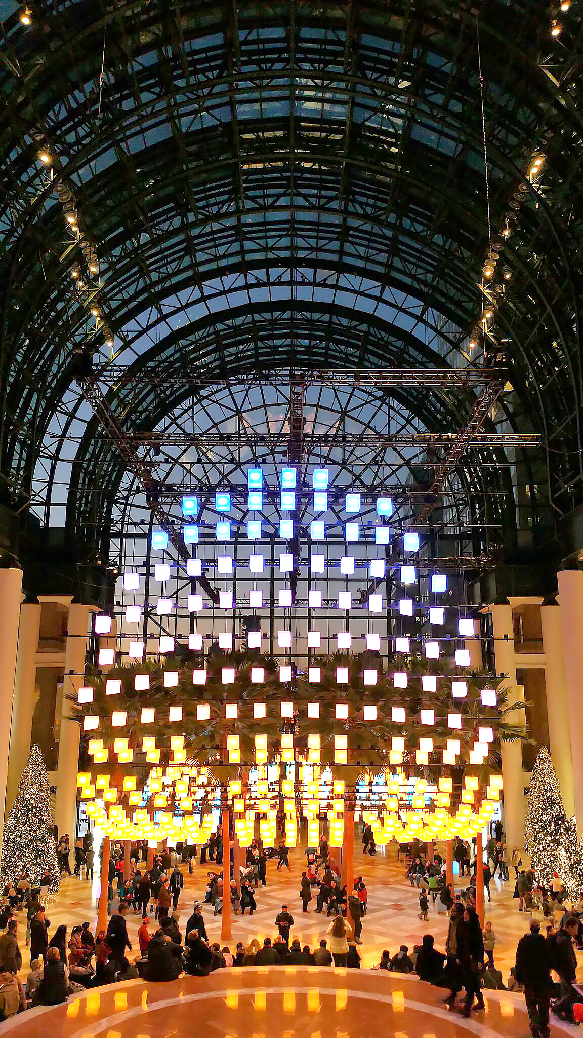 brookfield place est une galerie commerciale haut de gamme située juste en face du one world trade center. des tables et des chaises entourées de palmiers accueillent le visiteur sous une énorme verrière, en l’occurrence éclairée par une plusieurs rangées de cubes lumineux éclairant de couleurs changeantes, et dans un même mouvement onduleux, la descente d’escaliers. sur le palier, que l’on devine au premier plan sur la photo, des petits américains, ignorant encore la maîtrise du langage et le sens des mots, jouaient en se lançant des « apy gouznieur! » et des « hapi nounieur! ». je me rappelle avoir rigolé en pensant, dans ma ford intérieure, comme disait le poète: « yess, ceux-là, je les bats encore en anglais! ». lol