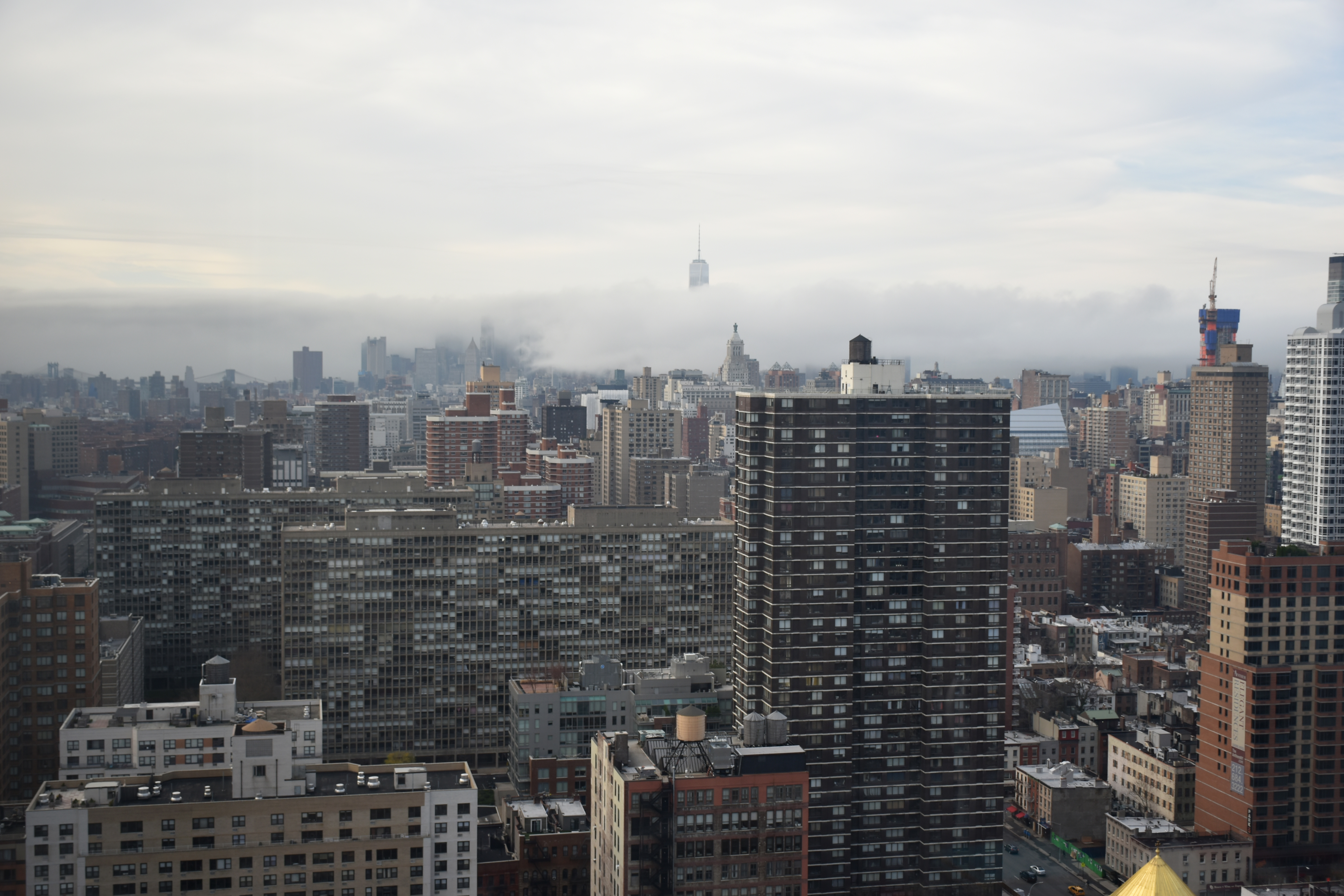allez, une ptite dernière pour la route. je sais, j’ai déjà montré cette vue, mais d’une part je ne m’en lasse pas, et d’autre part elle m’a paru intéressante car, ce matin-là, le brouillard envahissait progressivement manhattan par le sud, comme un gros monstre menaçant. seul le one world trade center a réussi temporairement à surnager la mer de nuages. une heure plus tard, une nappe à couper au couteau était sur nous. impressionnant. contempler manhattan plein sud depuis le 39e étage du corinthien est toujours magique pour nous. cette fois, j’avais pris avec moi une petite caméra timelapse qui permet de prendre des photos à intervalles réguliers sur de longues périodes et de les assembler en des séquences vidéo. on peut ainsi voir le temps s’écouler plus ou moins rapidement. pratique pour filmer l’activité d’une journée ou un coucher de soleil par exemple sans devoir rester derrière l’appareil pour le déclencher. voici ce que ça donne…