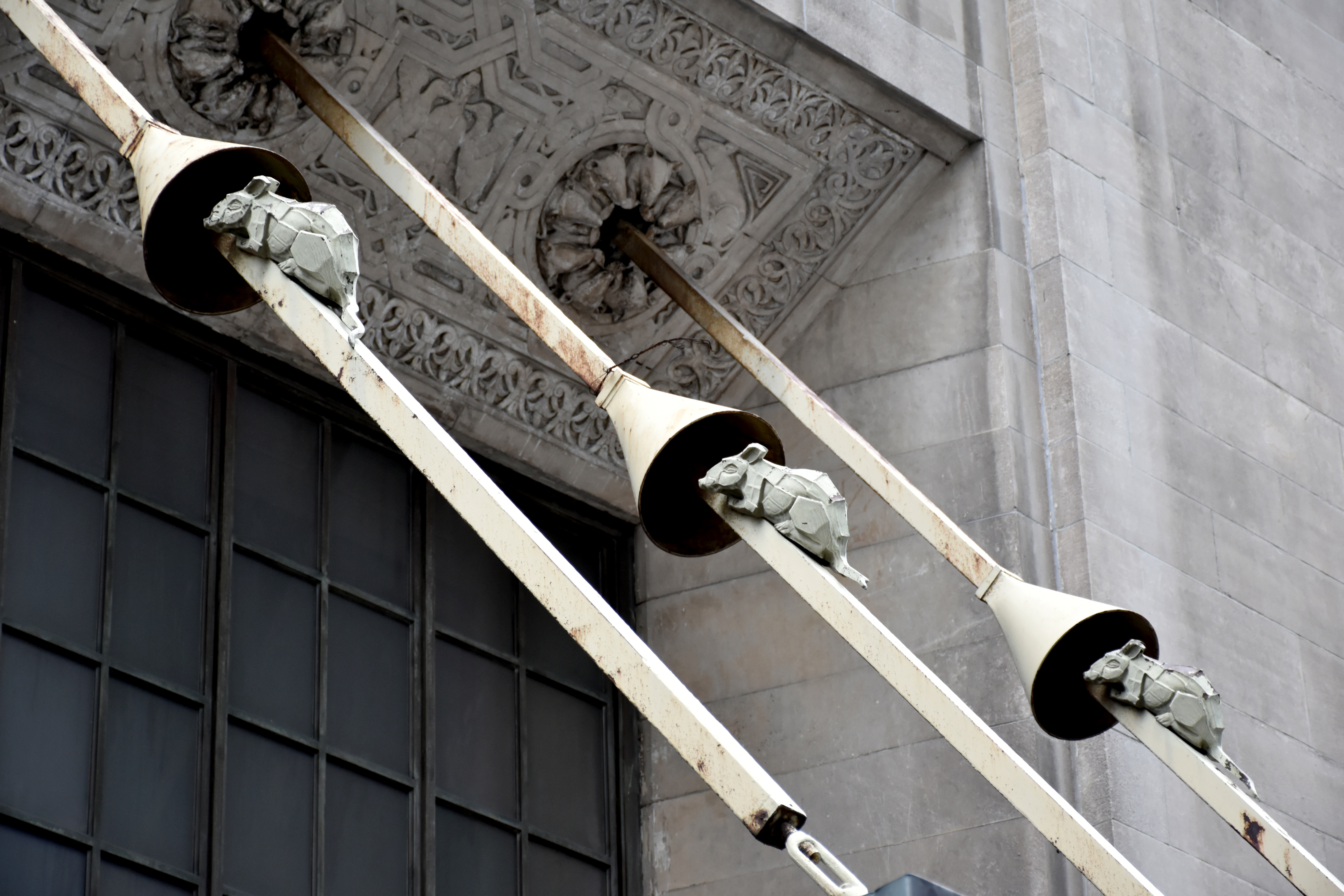 lors de la construction, en 1927, du graybar building (du nom de la graybar electric company qui le commanda), dans le prolongement de grand central sur lexington (420), les architectes ont ajouté à la façade des éléments maritimes en fonte. d’où les cordes, ici stylisées, utilisées pour amarrer les bateaux, agrémentés d’entonnoirs pour empêcher les rats de monter à bord. et si l’on regarde bien, chaque « corde » est relié à l’immeuble par des rosettes à têtes de rats. ce bâtiment, qui abrita des mastodontes de la presse magazine comme vogue et vanity fair, était aussi, à sa construction le plus grand bâtiment de bureaux du monde.