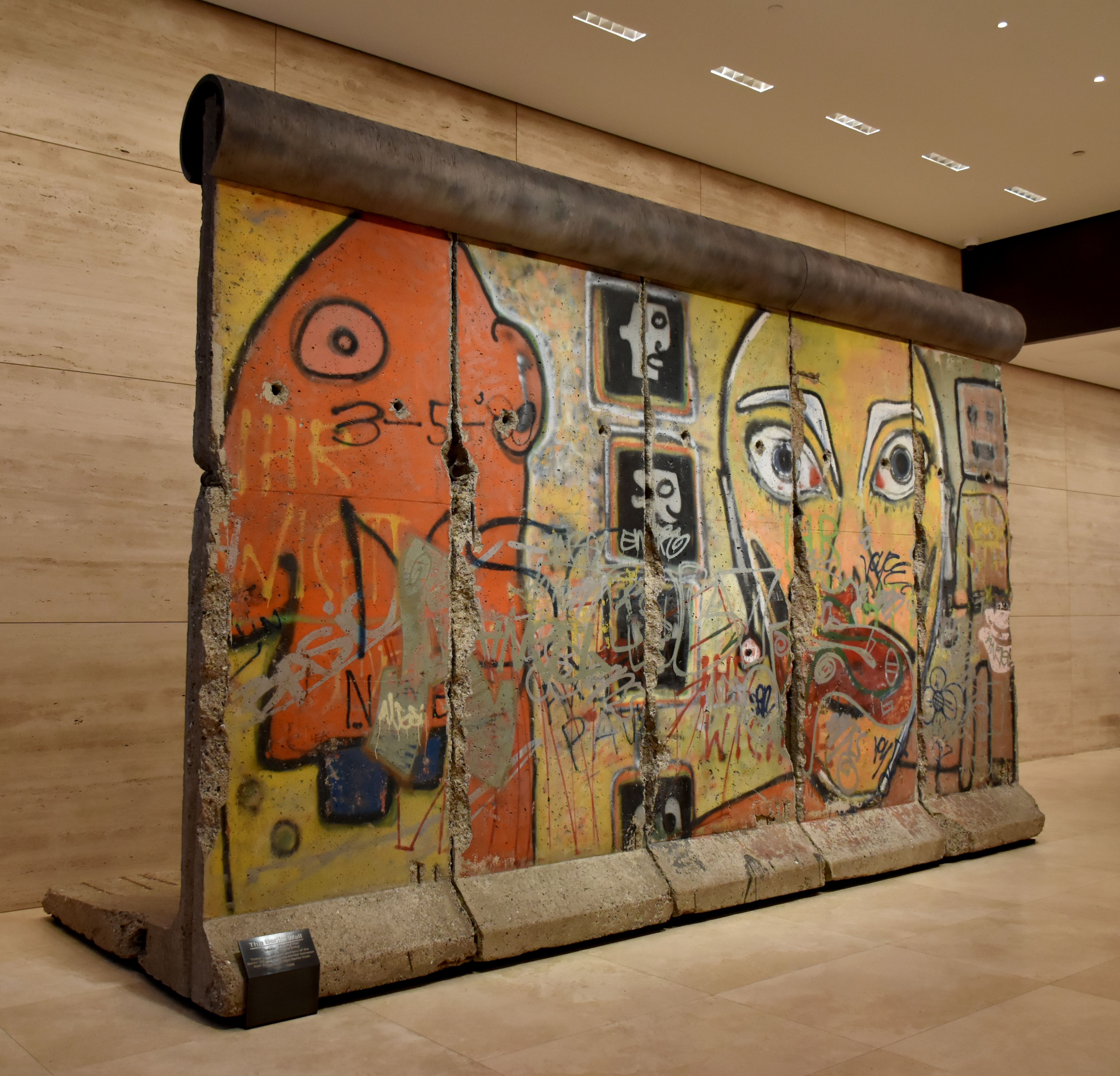 au 520 madison avenue, à hauteur de la 53e rue, cinq sections du mur de berlin regroupées en un seul bloc sont exposées dans le lobby d’un immeuble de bureaux. pas facile à trouver, j’aime autant vous le dire tout de suite. mais une fois qu’on y est, on a devant soi un morceau d’histoire qui résonne étrangement. car l’artiste français thierry noir, qui habitait en 1982 à quelques mètres du mur, et d’autres artistes, comme l’allemand kiddy citny ont bravé les interdits pour tourner en dérision ce symbole de la guerre froide. en cinq ans, ils se sont ainsi exprimé sur quatre kilomètres, faisant de cette portion de mur la plus longue peinture sur béton de l’histoire de l’art. le plus drôle, c’est que les autorités d’alors finiront par encourager ce projet. ce bloc imposant pèse douze tonnes. marrant à découvrir…