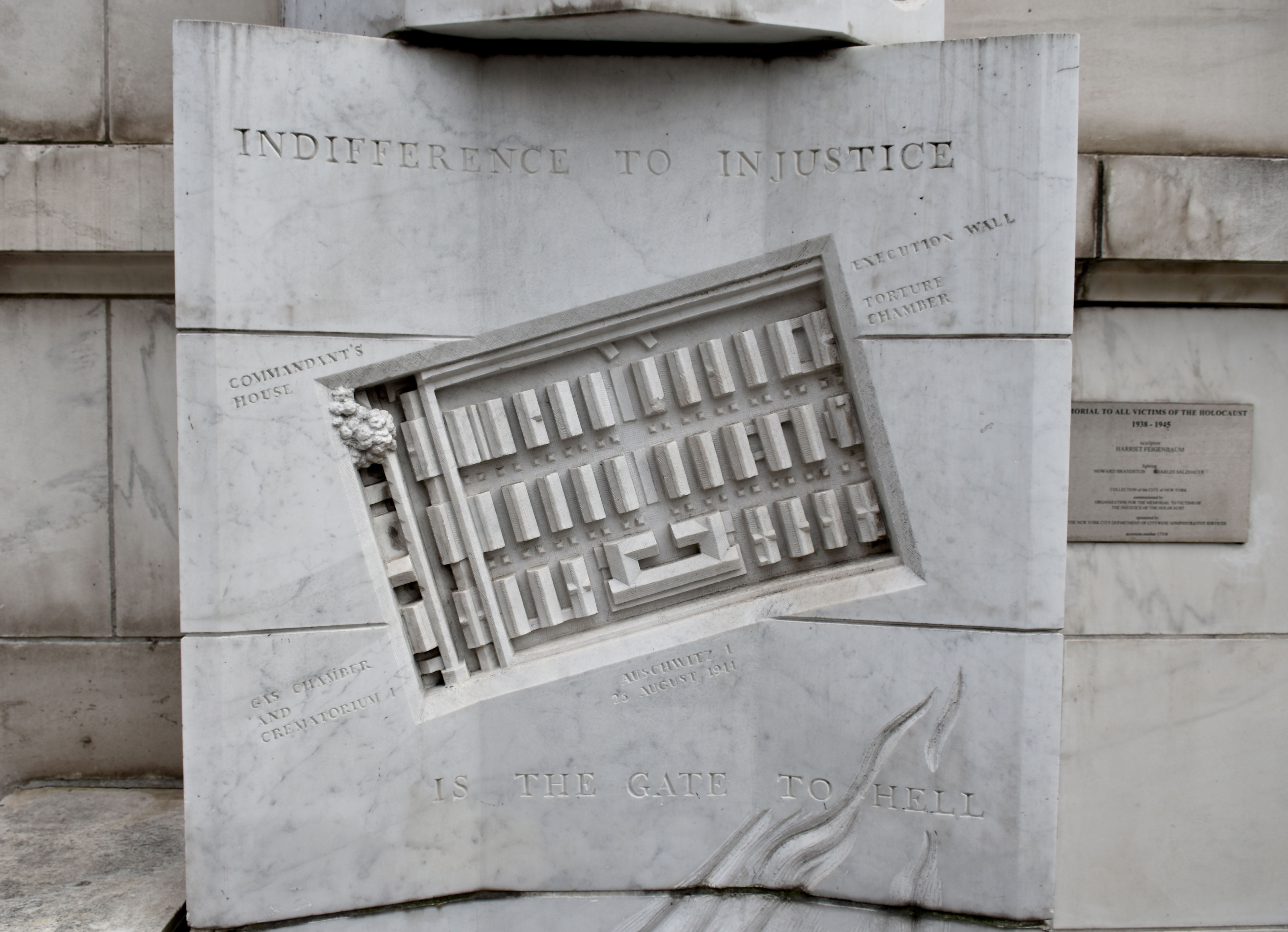 sur la façade de la cour d’appel de new york, à l’angle de madison, entre la 26e et la 27e, se trouve une sculpture de harriet feigenbaum, représentant à sa base une vue aérienne du camp d’auschwitz, d’après une photo prise par les alliés le 25 août 1944, sculptée dans un marbre de même couleur que celui de la façade de l’immeuble avec l’inscription gravée « indifference to injustice is the gate to hell ». évocation du crematorium d’auschwitz, une flamme en grande partie masquée vient lécher le mot « hell » et trouve un écho à la fois monumental et aérien dans la seconde partie de l’oeuvre, une demi-colonne hexagonale de 8 mètres de haut menaçant symboliquement de dévorer ce symbole de la justice qu’est la cour d’appel. le terme « injustice » fait ici référence à celle dont furent victimes les millions de déportés, bien sûr, mais également à l’inaction des nations occidentales, et notamment des américains, devant cette barbarie sans nom. par cette oeuvre, l’artiste dénonce le fait que tous savaient parfaitement ce qui se passait en allemagne mais que personne n’a rien fait. l’oeuvre, qui passe totalement inaperçu, fut inaugurée en 1990.
