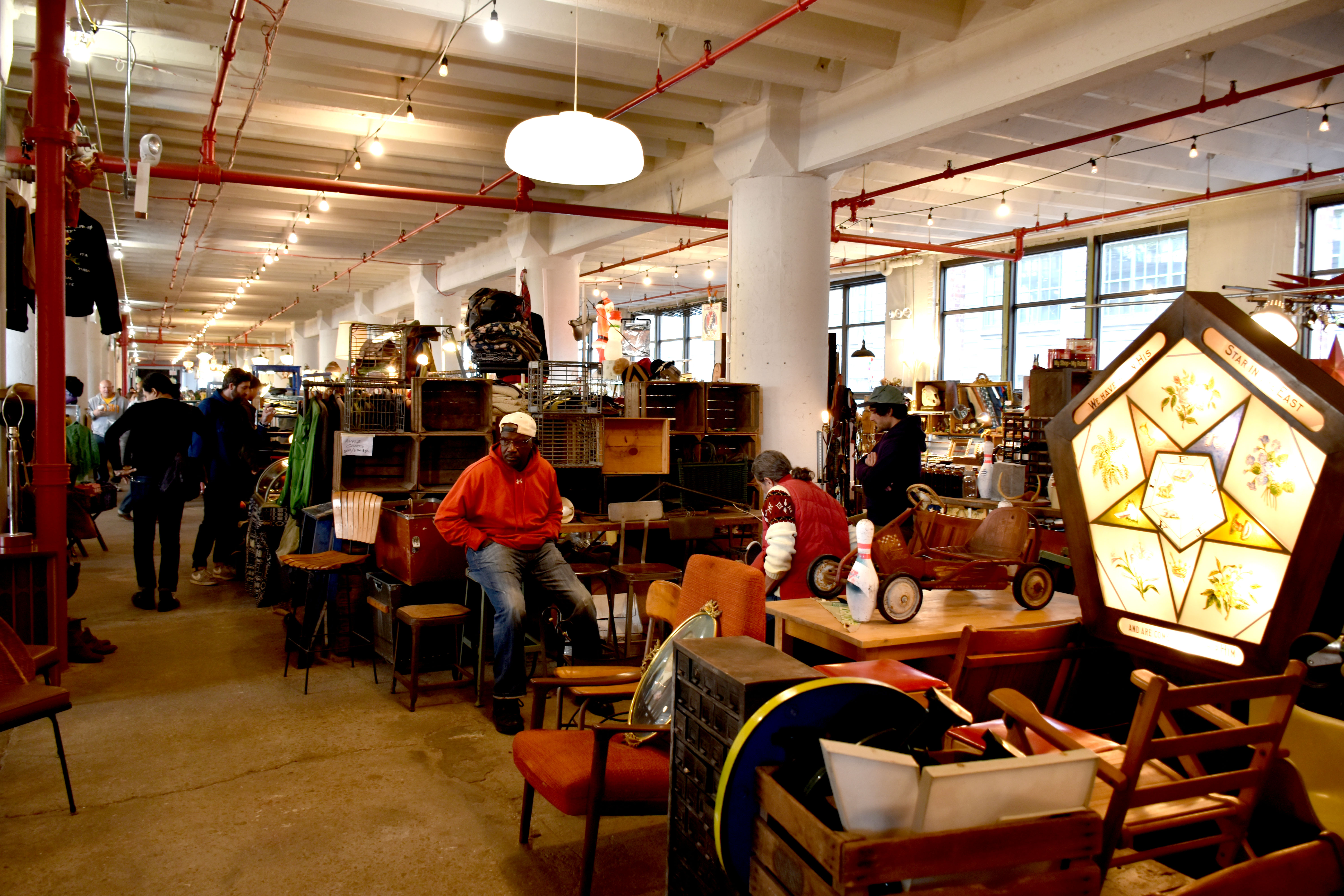 brooklyn est décidément une ville à découvrir. après coney island, à l’extrémité sud du borough, nous avons découvert cette fois le marché aux puces hivernal de smorgasburg. ouvert en 2011, smorgasburg est le petit dernier des marchés aux puces de la société brooklyn flea, fondée en 2008 et gérant les plus grands marchés aux puces de la côte est des états-unis. depuis manhattan, prenez le métro, lignes d, n ou r, jusqu’à la 36e rue (de brooklyn, pas de manhattan!). environ 20 minutes plus tard, vous vous retrouvez dans l’industry city, des bâtiments sans grande chaleur. sur l’un d’eux, un grand panneau (« brooklyn flea smorgasburg ») vous informe que vous êtes bien au bon endroit. désert, avec des salles de resto ou de cours, on ne sait pas bien, le rez-de-chaussée contraste avec le 1er étage (2nd floor selon la terminologie américaine, le rez-de-chaussée étant compté comme un étage) qui grouille de vie et d’animation. 100 exposants dévoilent de véritables trésors vintage américains: vieux appareils photos, objets de pub, meubles, bibelots en tous genres, bric-à-brac local qui fait remonter à la surface tout un tas d’émotions et d’envies de toujours que l’on avait fini par oublier. j’ai ainsi fait l’acquisition de deux verres à limonade datant de 1939 et décorés aux couleurs de la new york world’s fair (autrement dit l’exposition universelle) de 1939: l’un avec l’administration building, l’autre avec le communications building. selon le vendeur, ils auraient 76 ans. n’étant pas spécialiste, je ne sais pas si c’est vrai, mais peu importe, les objets viennent quand même de là et c’est déjà une émotion particulière. artisans, fleuristes ou stylistes exposent également et si vous avez faim, près de 40 stands proposent dans un (grand) espace dédié à toutes sortes de cuisines, du bio au hamburger, avec places assises ou non. le new york times l’a même qualifié de « woodstock de la bouffe ». il faut s’armer de patience car les files d’attente sont nombreuses et longues. l’endroit est ouvert tous les week-ends de 10h à 18h jusqu’en mars. à découvrir absolument…