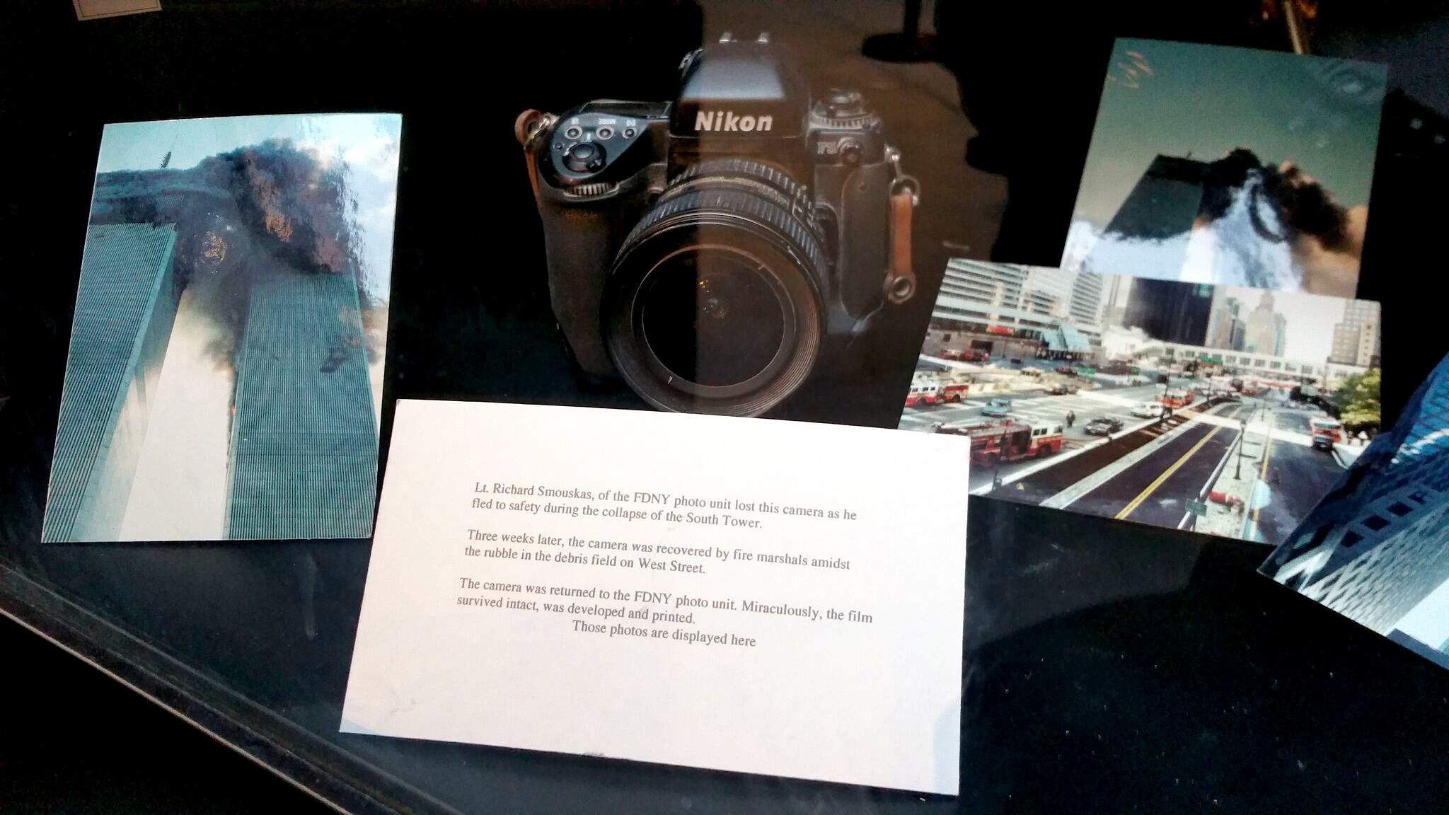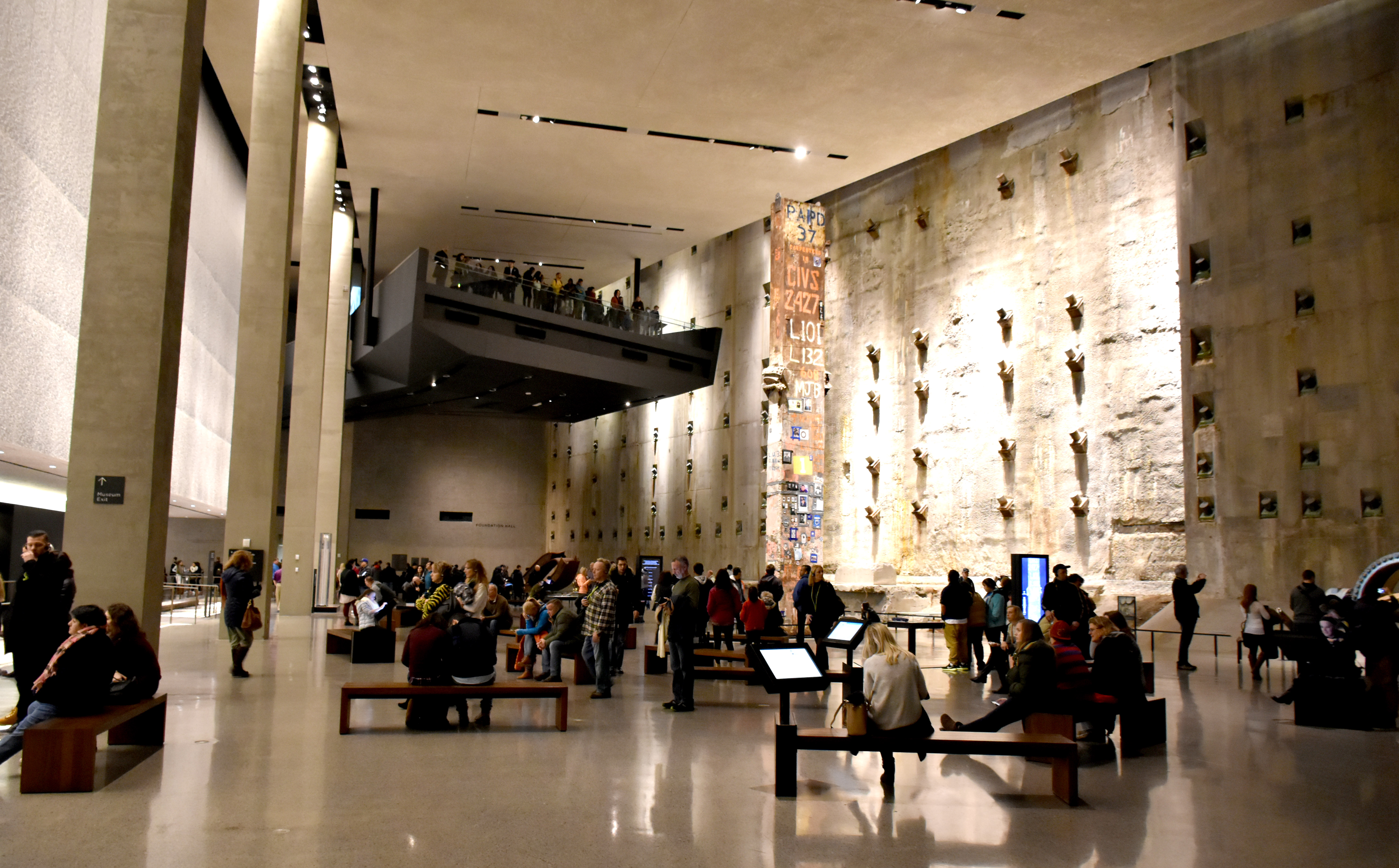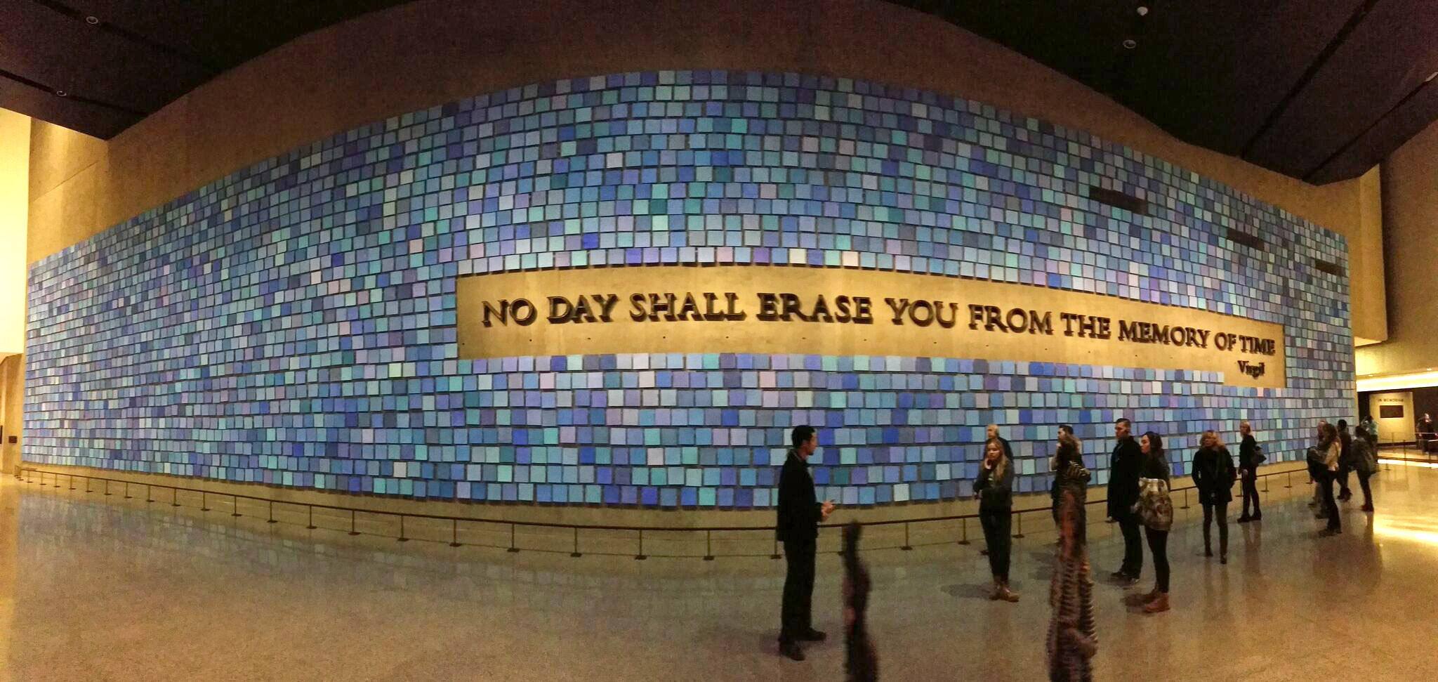 on le sait, ground zero est désormais un lieu de mémoire, d’hommage et de commémorations. ainsi, outre les deux bassins, nord et sud, ornés sur leur rebord des noms des victimes des attentats, se trouve également le musée du mémorial, sorte de grotte souterraine que l’on ne soupçonne pas un instant aussi immense de l’extérieur. ce musée est, peut-on lire sur son site internet, la principale institution du pays dédiée à explorer les implications des événements du 11 septembre et leurs effets durables, ainsi qu’à consigner et à décrire leur impact. tout y est, des morceaux de la fondation, de poutrelles métalliques, de murs, à un fragment de l’antenne de 110 m, en passant par l’escalier qu’empruntèrent certaines des victimes, une brique de la maison de ben laden, le nom de toutes les personnes qui ont perdu la vie ce matin-là et l’un des véhicules de pompiers. sur un mur immense, un artiste a tenté, à l’aide de 2977 (le nombre des victimes) petites feuilles de papier peintes chacune dans un bleu différent, de recomposer la couleur du ciel ce matin-là, accompagnées d’une citation de virgile: « no day shall erase you from the memory of time » (nulla dies umquam memori vos eximet aevo, autrement dit « les jours n’effaceront jamais votre souvenir de la mémoire du temps »).