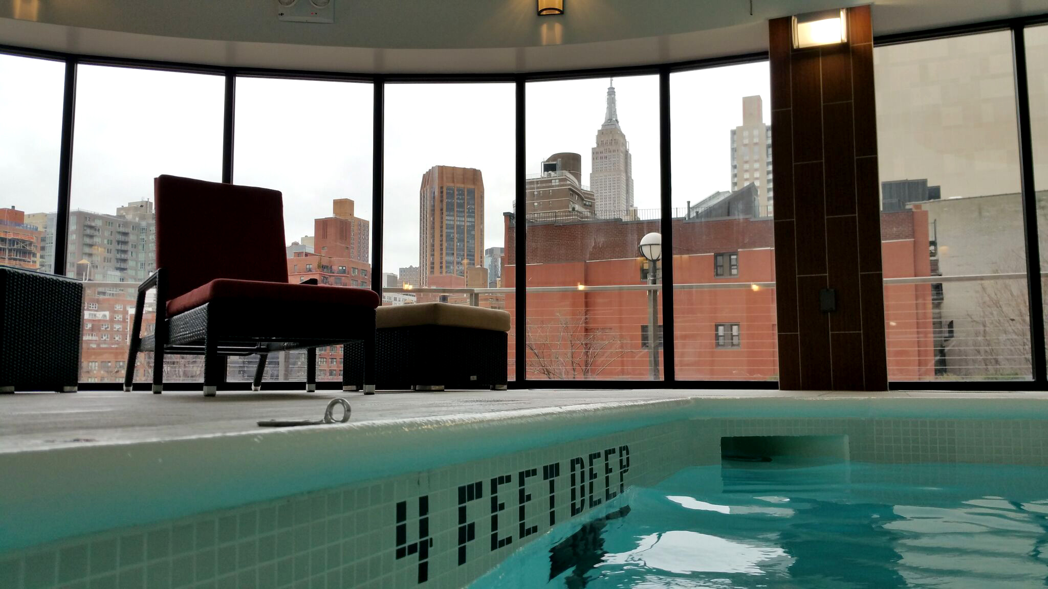 le corinthien (mais il n’est évidemment pas le seul à manhattan) a ceci d’agréable, entre autres choses, qu’il propose à ses habitants un « complexe » sportif au 4e étage comprenant une piste de jogging qui fait le tour de l’immeuble (plus confortable, pour ceux qui joggent, que dans les rues), une salle de fitness/musculation plutôt bien équipée, un solarium extérieur et une piscine avec petit coin jacuzzi. une idée bienvenue quand on a passé la journée à crapahuter dans la grande pomme (et dieu sait si on en fait, des kils!). vive le luxe. surmontée d’une verrière d’où l’on peut voir un morceau de building s’élancer vers des cieux pas toujours cléments, on peut, à l’inverse, voir s’il y a du monde qui barbote depuis le 39e étage. pratique. et en plus, depuis le bassin, on voit le copain (dans la langage giamarchiste, il y a beaucoup de copains à new york. en l’occurrence, il s’agit de l’empire state; un autre est le pont de brooklyn; un troisième est le parachute drop à coney island; un quatrième est le little red lighthouse, sous le pont george washington). pour tous ces moments privilégiés de détente, merci md :O)!