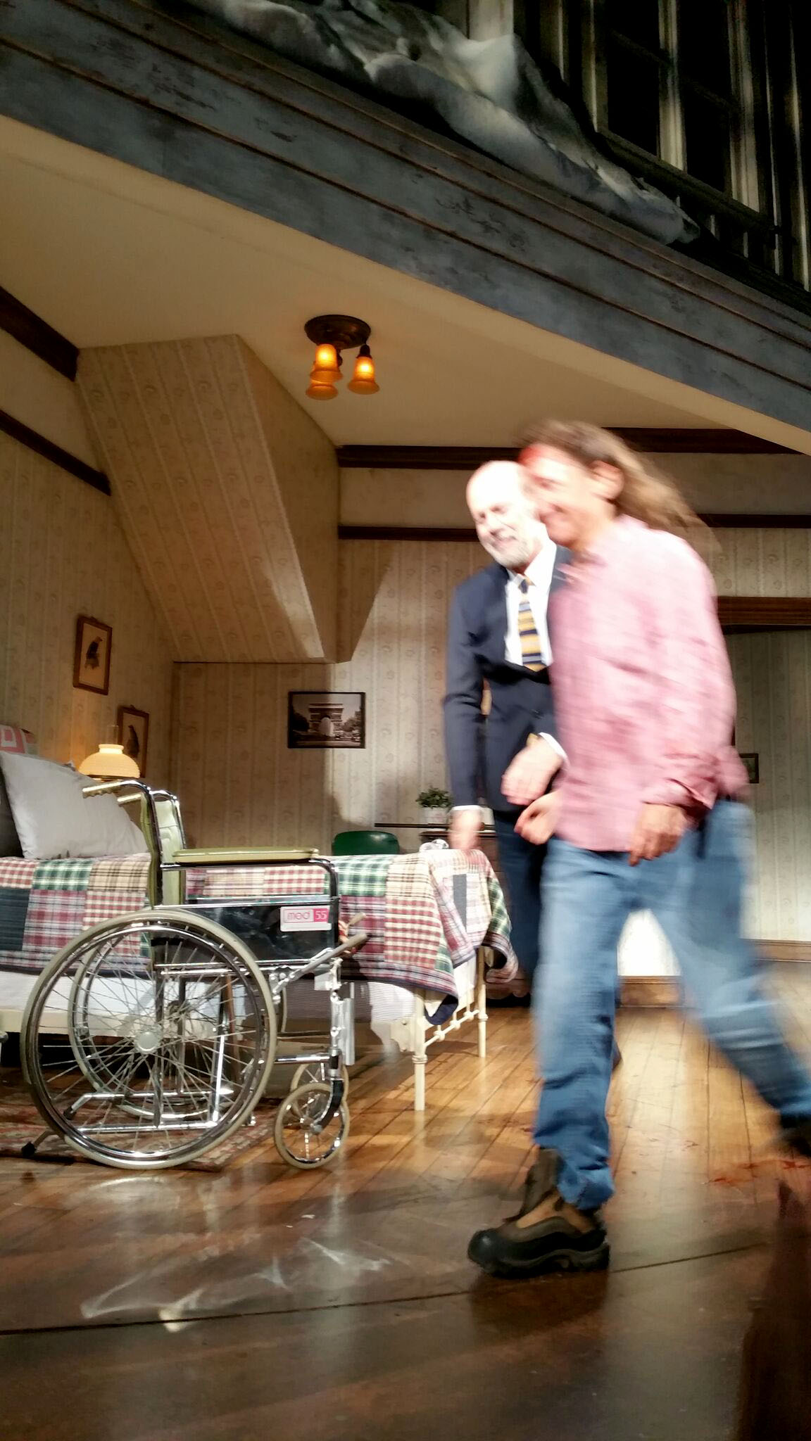 bruce willis sur scène à broadway, au broadhurst theatre pour être précis, à une distance qui variait entre 5m et 1m50, qui plus est dans le fameux huis clos de stephen king, honnêtement, on ne pouvait pas rater ça. et honnêtement, laurie metcalf, sa partenaire, était bien meilleure que lui qui ne nous a pas sidérés par sa performance. certes, toute l’histoire est centrée sur le personnage féminin et, à sa décharge, le rôle de paul sheldon est davantage celui d’un faire-valoir (même s’il faut que l’acteur qui le tient soit crédible dans la manifestation de la douleur, ce que willis, il faut lui laisser cela, fait très bien). cela dit, les cheveux grisonnants, qui plus est en bataille, ça vieillit en général, mais ça le fait encore plus sur un bruce willis qu’on est habitués à voir porter la calvitie glamour… ni éblouissant ni décevant, juste bien, et sympa de l’avoir vu en live. coup de chapeau au chef déco pour la conception du décor: la chambre, le vestibule, la cuisine et l’entrée extérieure de la maison étaient présentés sur un même plateau rotatif tournant au gré des scènes et permettant aux comédiens de se déplacer (quasiment sur place) pendant la rotation. les effets que l’on voit dans le film (la fameuse scène des chevilles et le meurtre du shérif) ont été reproduits ici de manière quasi cinématographique, limite gore. désolé pour la photo, je n’ai pas eu la présence d’esprit de sortir le portable plus tôt… allez, une photo officielle pour me faire pardonner…