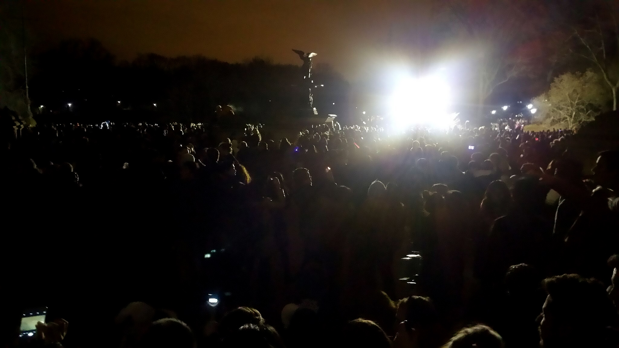 contrairement au planton du corinthien qui m’a dit avec le plus grand sérieux qu’il n’y avait rien – c’est ça, prends-moi pour un con – il y a BEAUCOUP de choses que l’on peut (doit) faire pour célébrer le passage de l’an à new york. il y a bien sûr la montée de la boule à times square, mais il faut aimer la foule dense et compacte. et honnêtement, se taper plusieurs heures à attendre debout dans un froid parfois glacial, juste pour avoir une bonne place et se retrouver coincé sans pouvoir ni bouger ni sortir pendant autant de temps, euh non merci. moi qui déteste les foules et qui ai vécu dans ma vie deux expériences qui auraient pu mal se terminer, je préfère m’asbtenir. times square le 31 décembre, d’accord, mais vu du marriott, tranquillement au chaud et si possible à la hauteur de ladite boule. à part ça, il y a aussi central park. nous y sommes donc allés vers 23h côté est à la hauteur de la 72e, pile poil sur terrace drive, un peu au nord de l’endroit d’où les feux seraient tirés une heure plus tard. il y avait un monde fou mais curieusement de l’espace en veux-tu en-voilà (le parc est, il faut le rappeler, immense), un concert sur rumsey playfield avec de la musique qui massait bien. après une courte balade, des photos et des selfies à gogo, nous sommes allés nous asseoir, avant que la foule ne les prenne d’assaut, sur les marches d’escalier de bethesda terrace, là où de nombreux films ont été tournés (rançon, avec mel gibson, les avengers, etc.). j’avais lu que les feux partaient de naumburg bandshell, un rocher situé un peu plus au sud (en fait, j’ai eu l’impression qu’ils ont été tirés plus près, sur cherry hill). à minuit pile, après un court décompte de la foule amassée, les feux ont été lancés avec la précision d’une montre suisse. et on n’a pas été déçus. on l’est très rarement à new york.