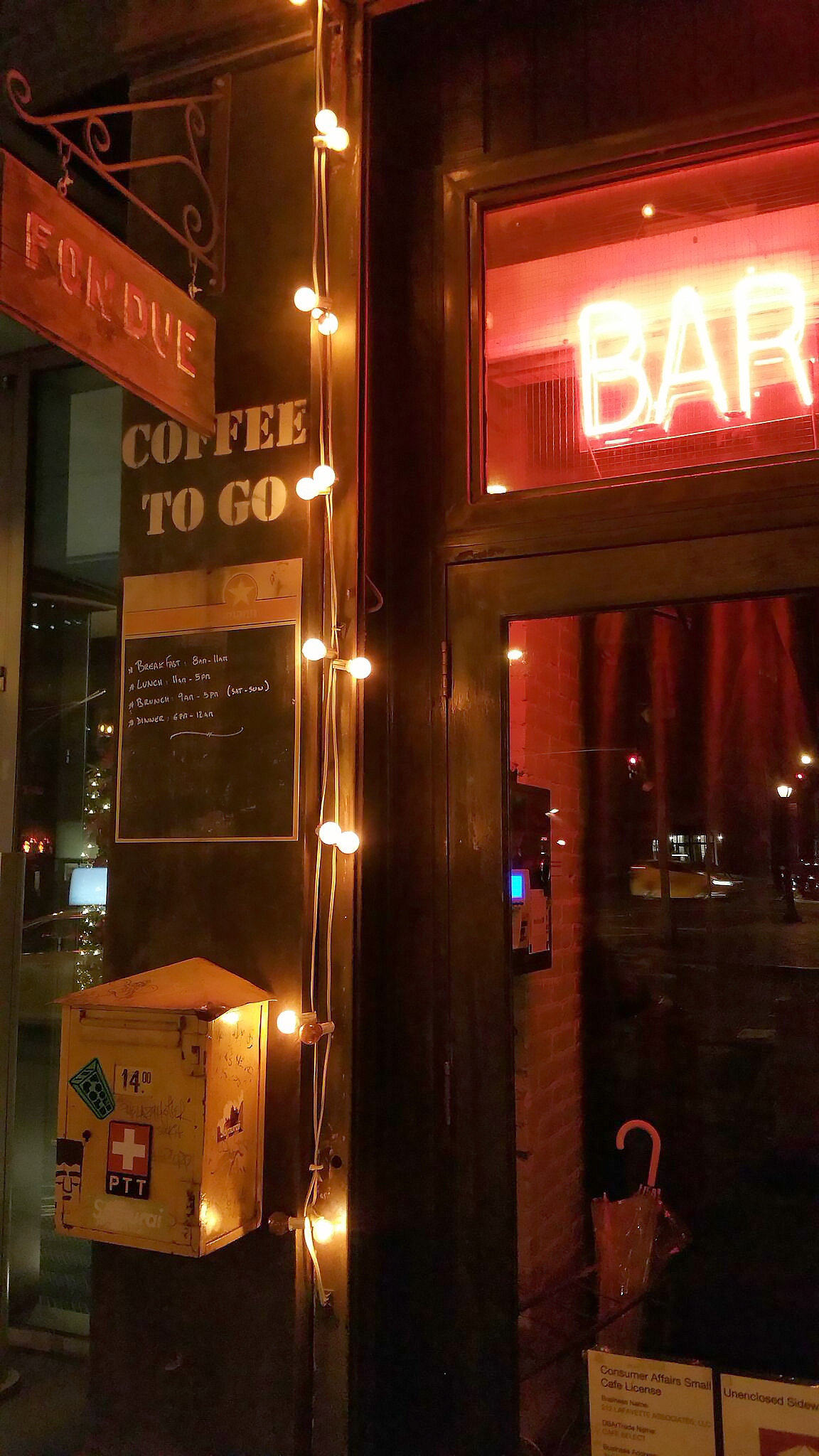 alors que nous étions sortis un dimanche soir chercher un resto dans soho, nous sommes tombés au détour d’une rue sur le café select (écrit avec l’accent, silvôplé), au 212 lafayette street, en bordure de chinatown. ce resto a ceci de particulier qu’il est suisse. ou du moins qu’il en a l’air. à part qu’on peut y manger de la fondue et y boire du rivella ou de la liqueur d’edelweiss, l’endroit est décoré d’objets (une boîte à lettres jaune vous accueille à l’entrée, une horloge murale rolex surplombe une table), d’affiches (ici une expo « dada in zürich », en allemand dans le texte, là un biopic de jo siffert) et de pubs (une plaque rivella au-dessus du bar, une autre pour les pneus maloja) qui donneraient le mal du pays aux moins nostalgiques. si la salade de poulpe était délicieuse, le veal schnitzel n’avait rien d’exceptionnel. et la musique, du jazz-rock ou du free jazz, était bien trop forte pour nos oreilles vieillissantes. dommage car l’endroit et le service étaient sympa.