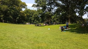 prospect park est à brooklyn ce que central park est à mahattan, bien que beaucoup moins grand. mais, même s’il ne peut rivaliser en taille, le traverser du nord au sud prend un temps fou. et nous n’en avons fait que la moitié à peine. ah, les distances américaines… moi qui pensais que ce serait plat et dégagé: mélange de vallons, de forêts, de lac et d’espaces dégagés et néanmoins gazonnés. j’aime les surprises. il fait chaud mais la brise apporte cette douceur de vivre toute dominicale. ici des familles groupées discutent debout, là des jeunes disputent âprement une partie de rugby, à gauche des lecteurs lisent, leur vélo couché comme eux, à droite des communautés entières se montrent solidaires autour de quelques saucisses. tout droit, armés de gants de baseball, un père joue avec son fils à se lancer des balles en bois gainées de cuir. typique. partout ça sent la grillade et l’atmosphère est bon enfant. on se croirait à bagatelle. ou à central park. ou à hyde park… et tandis que la vie brooklynienne se déploie, paisible, devant nous, nous savourons, dans notre bento à deux étages, un repas simple mais délicieux, préparé avec amour et talent…